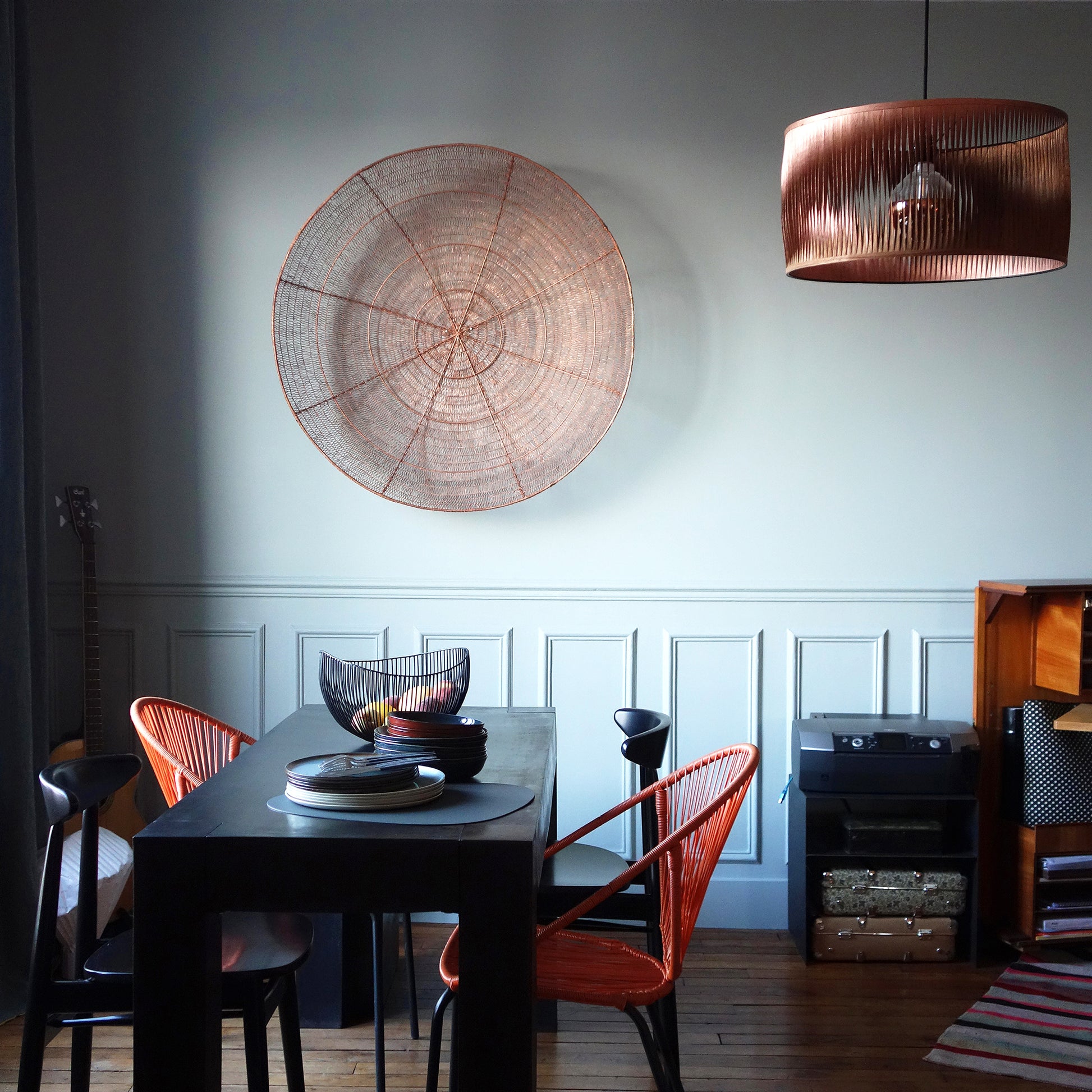Avec ses jeux d’optique et les ombres portées qu’elle génère en version nuit, cette suspension est hypnotique ! Modèle particulièrement éclairant puisque très ouvert. La luminosité se diffuse aussi bien par le bas et le haut de l’abat-jour qu’en s’immisçant au travers des lamelles. Eclairage modulable en fonction de l’ampoule retenue (filament, opaline, translucide…). En vrai caméléon, elle s’adapte à toutes les pièces de vie : entrée, cuisine, salon, séjour, bureau, couloir, chambre à coucher...