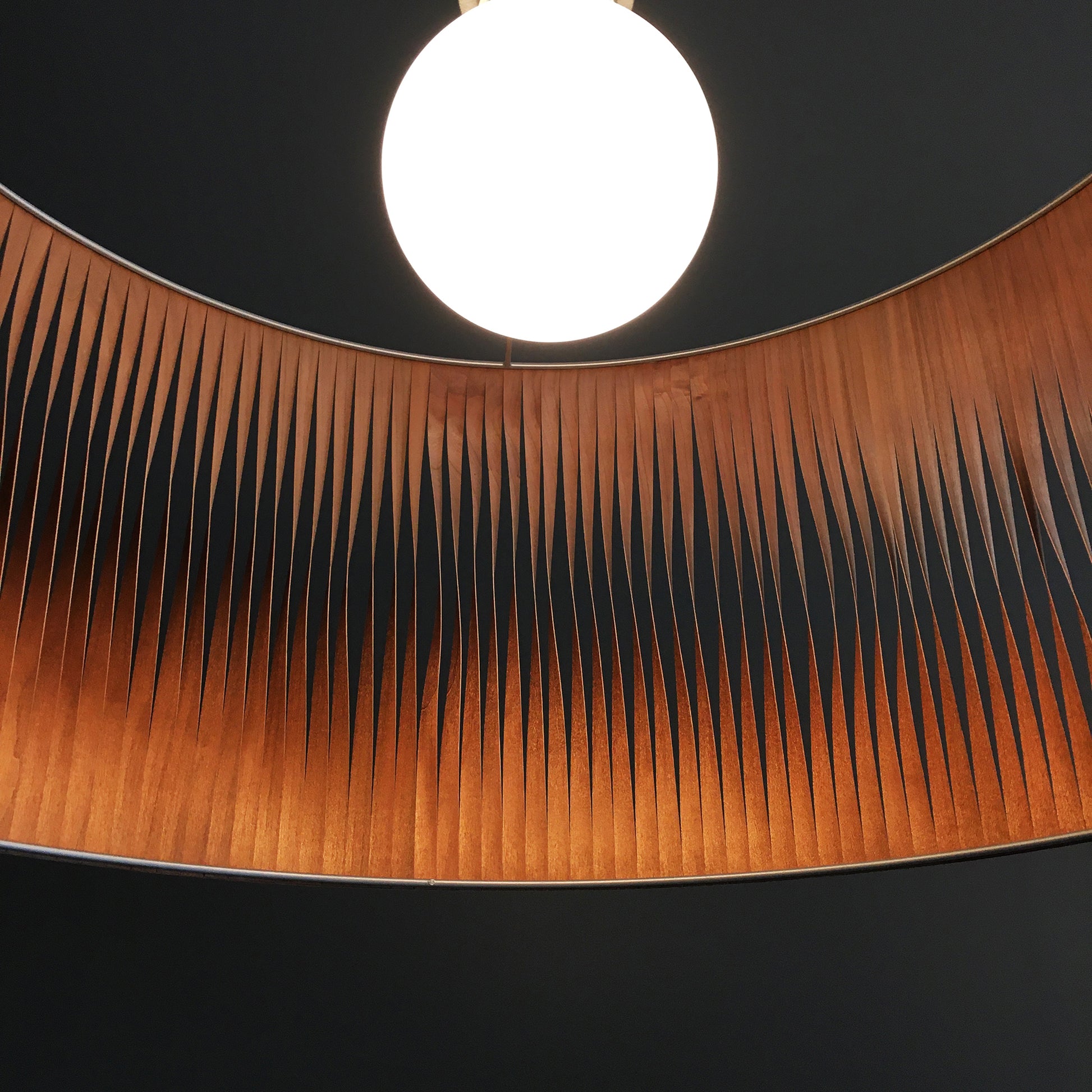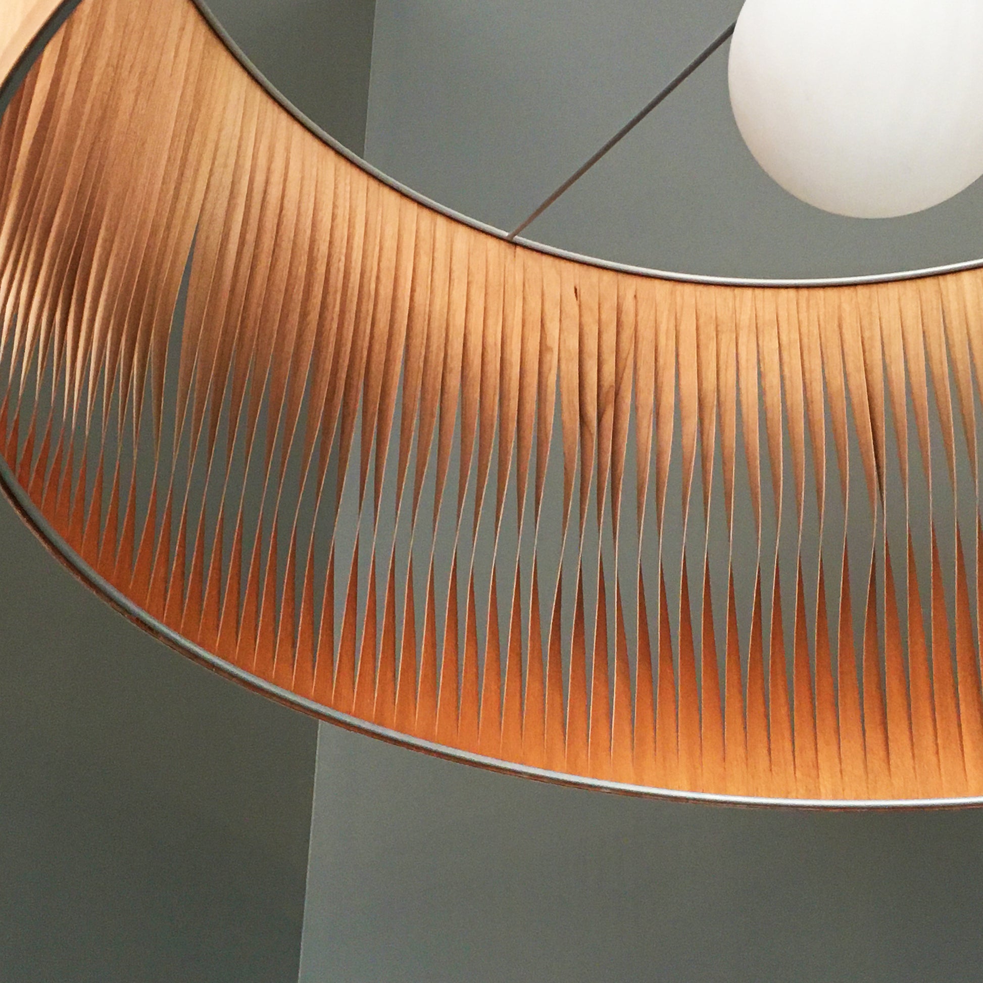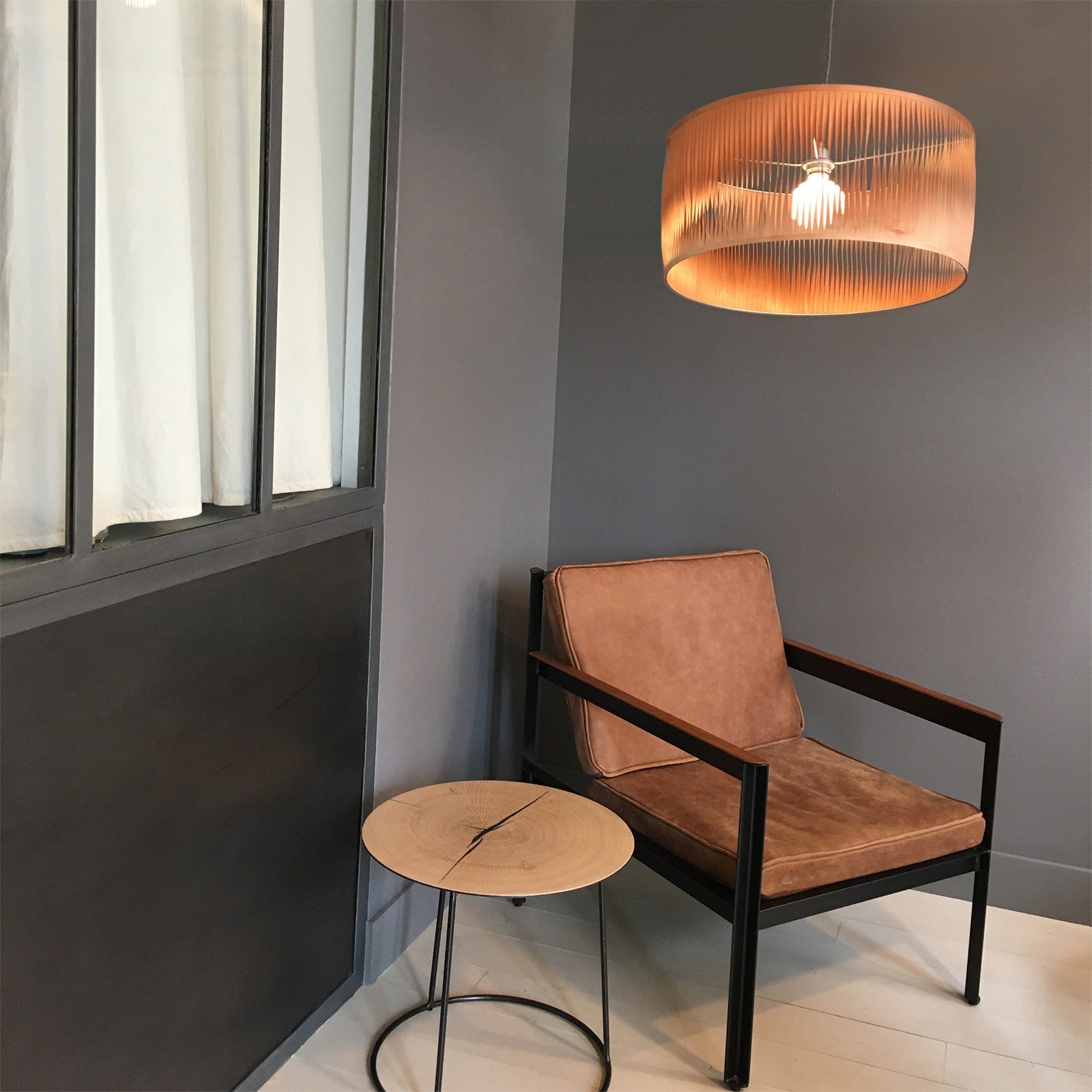 Avec ses jeux d’optique et les ombres portées qu’elle génère en version nuit, cette suspension est hypnotique ! Modèle particulièrement éclairant puisque très ouvert. La luminosité se diffuse aussi bien par le bas et le haut de l’abat-jour qu’en s’immisçant au travers des lamelles. Eclairage modulable en fonction de l’ampoule retenue (filament, opaline, translucide…). En vrai caméléon, elle s’adapte à toutes les pièces de vie : entrée, cuisine, salon, séjour, bureau, couloir, chambre à coucher...